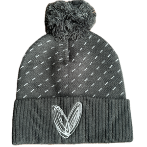 The 100% acrylic knit cap with a solid color ribbed cuff with a solid color pom. The cap features a white diagonal dashed knit-it pattern throughout its crown.